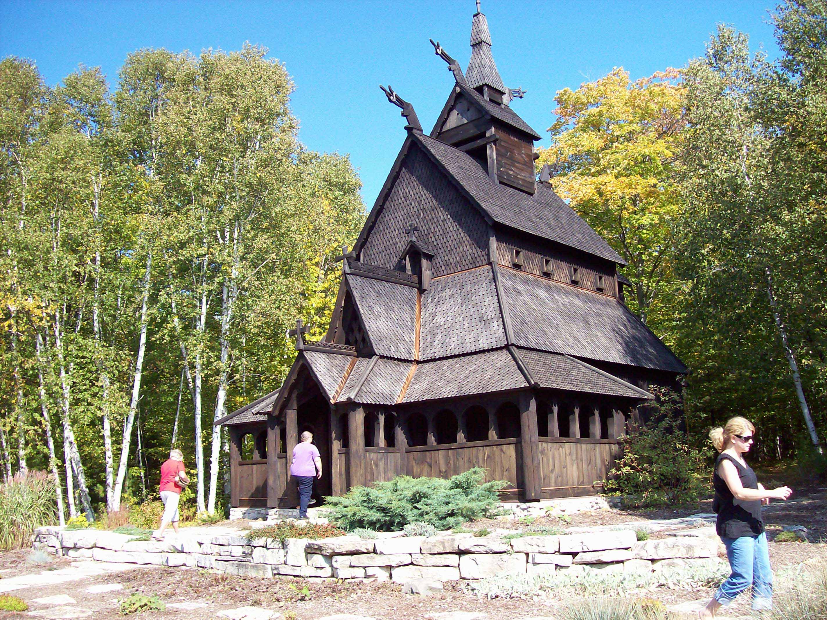 Stavkirke (Stave Church), a replica of one in Borgund, Norway, was build in the past 10 years by the congregation of the Lutheran Church. They have services on Wednesday evening at the Stavkirke at 7:00