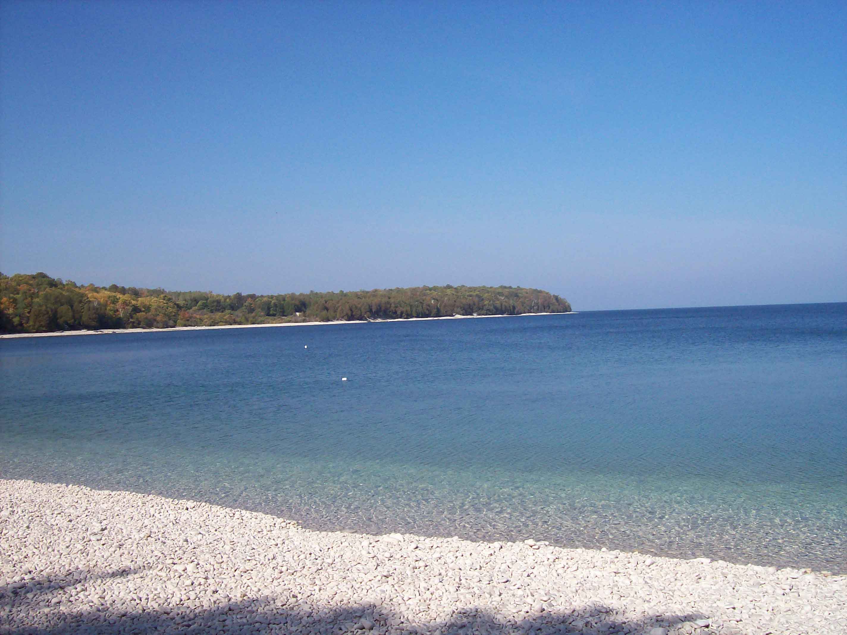 Schoolhouse Beach on Washington Island. A geological marvel, this smooth limestone beach provides excellent swimming for advanced swimmers in a marked area with a diving raft. If you aren’t a fan of sand in your shoes this is a must see. The crystal clear waters of Lake Michigan are best visited with a north wind to bring in the warmer surface waters of this deep harbor. The water deepens fairly quickly and diving, rafting or snorkeling is great. (Caution: please don’t take the rocks as this resource has suffered from the past removal of loads of stone and the maturation of trees in the parking and picnic area.).